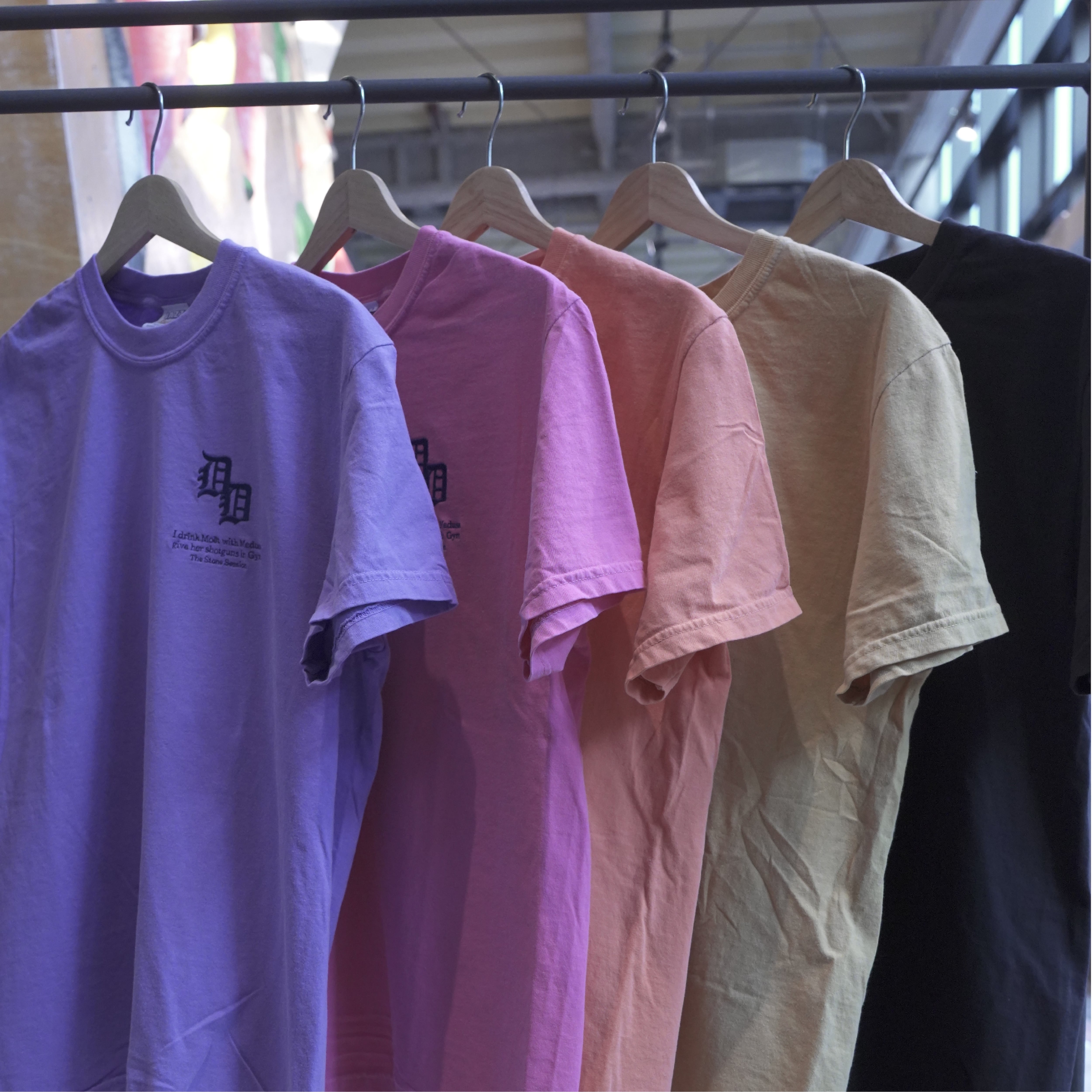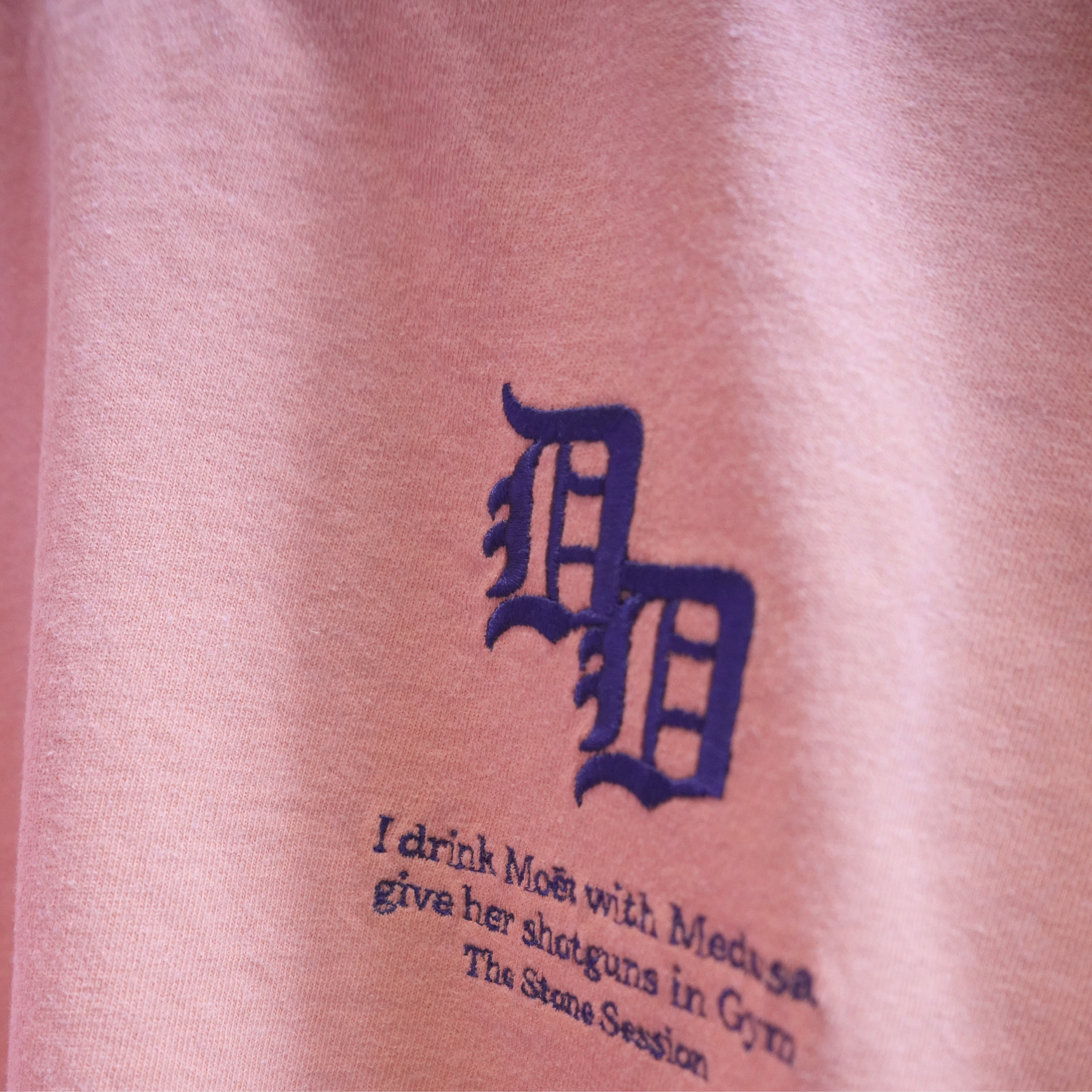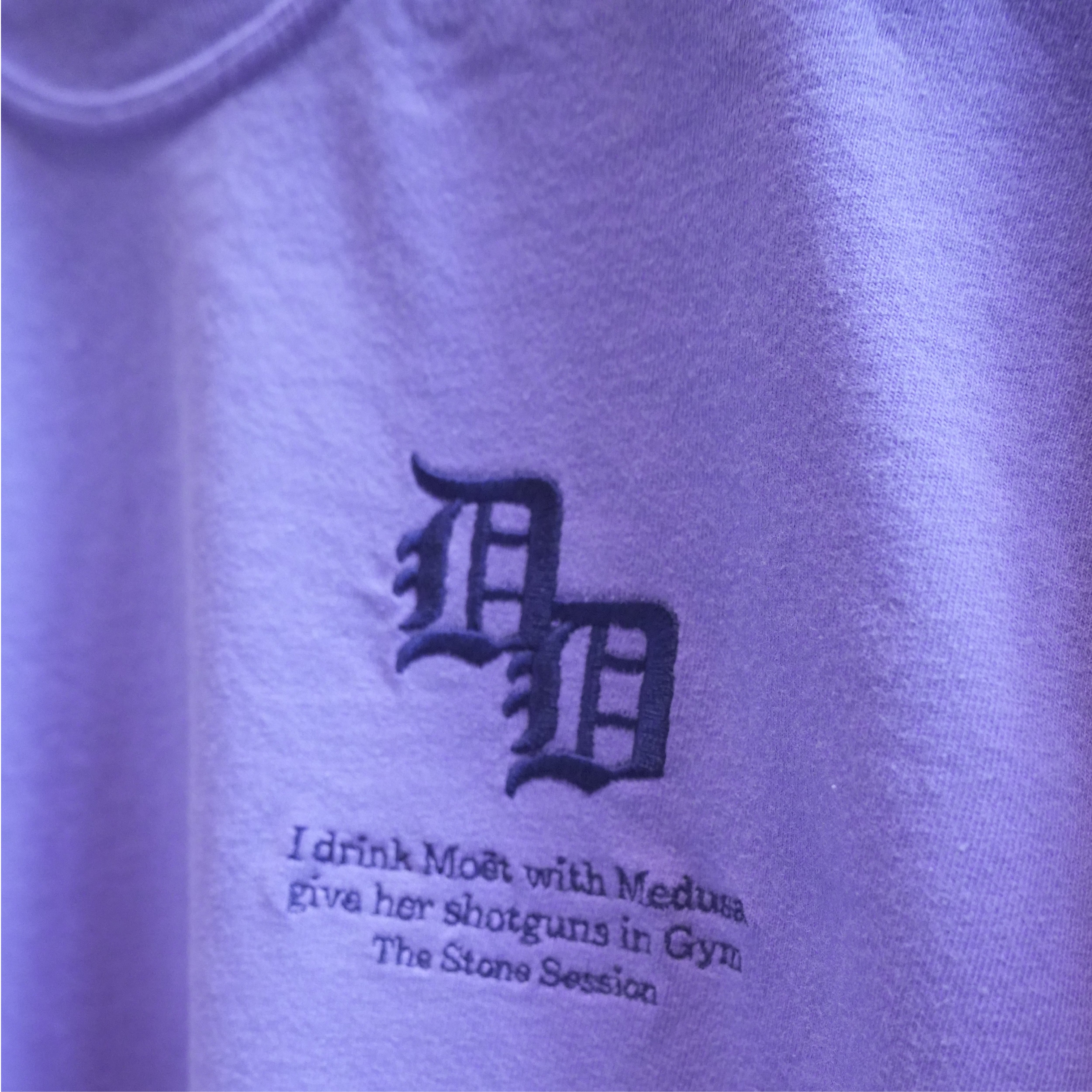左胸は刺繍仕様でダブの大好きなデトロイトタイガースのDで名前の頭文字DDが!更にその下には敬愛するラッパーのNASのパンチラインが....背面は4色のスクリーンプリントでTHE STONE SESSIONの文字にもしっかりチョーク(白い粉)が積もっており細かいディテールも楽しい1枚となってます。